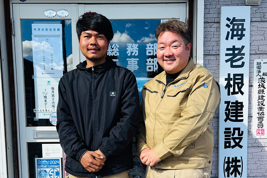 茨城県久慈郡大子町に本社を置く海老根建設株式会社は、大正5年創業の老舗建設会社です。道路工事や法面工事を主力とし、従業員34名のうち2名がミャンマー出身の技能実習生。2026年2月には、茨城県外国人受入優良企業等認定制度の第1回認定企業にも選ばれました。