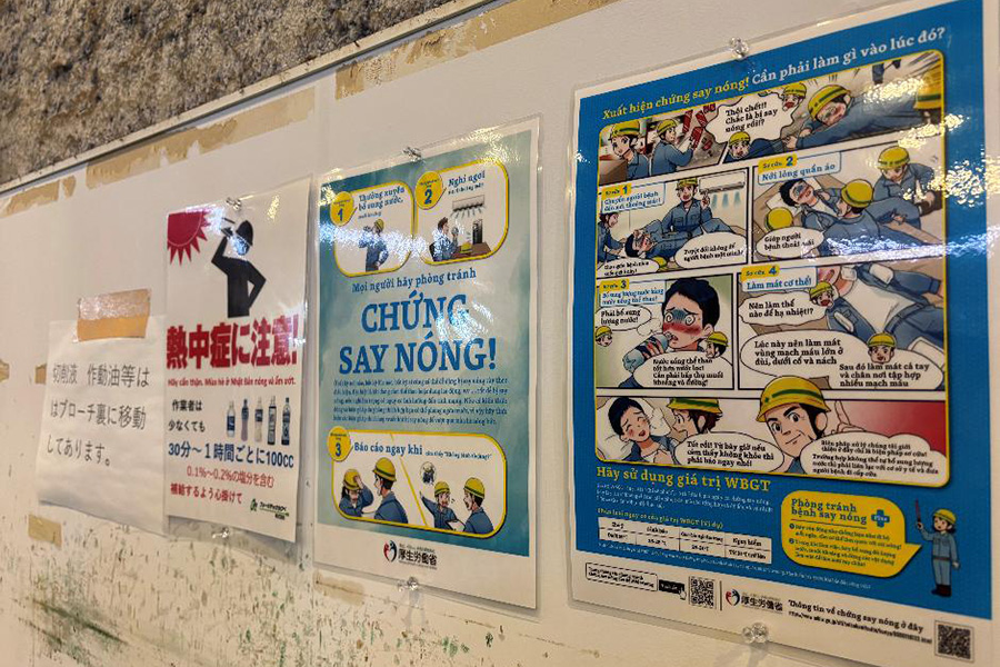 入社時には、安全衛生担当者がベトナム語・インドネシア語の資料を使った研修を実施します。「なぜ安全第一なのか」という根本から多言語で説明した上で、現場に入ってからは指導員が言葉で徹底的にフォロー。現場には「走るな」などベトナム語の注意表示も配置しています。